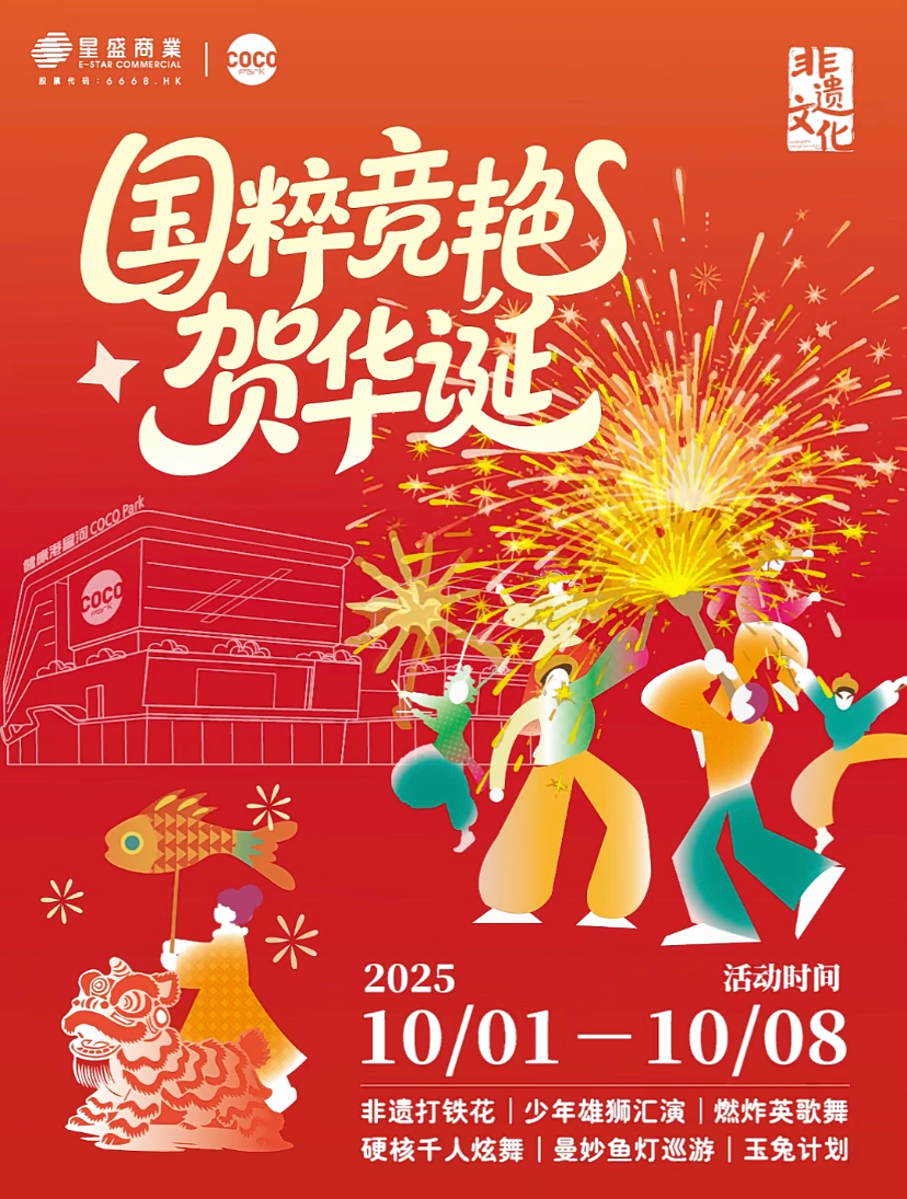 国庆邂逅中秋,广州健康港星河COCO Park 以“国粹竞艳 贺华诞”为主题,融合红色氛围、非遗文化与全运消费优惠,打造“文化体验+实惠消费”双驱动的国庆活动矩阵。